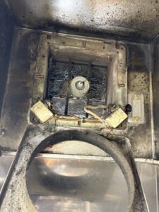 既存の古い機種を撤去し、ダクト内部の清掃と配線の安全確認を行いました。Before写真1枚目の通り外観の劣化も激しく、2枚目の内部写真では油詰まりが深刻でしたが、最新の省エネモデルへ迅速に交換いたしました。