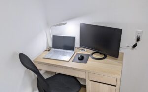 After写真では、増設されたコンセントから書斎の机に設置されたパソコンへ電源が供給されている様子が確認できます。机の近くにコンセントが設置されたことで配線が整理され、作業スペースを広く使える環境になりました。